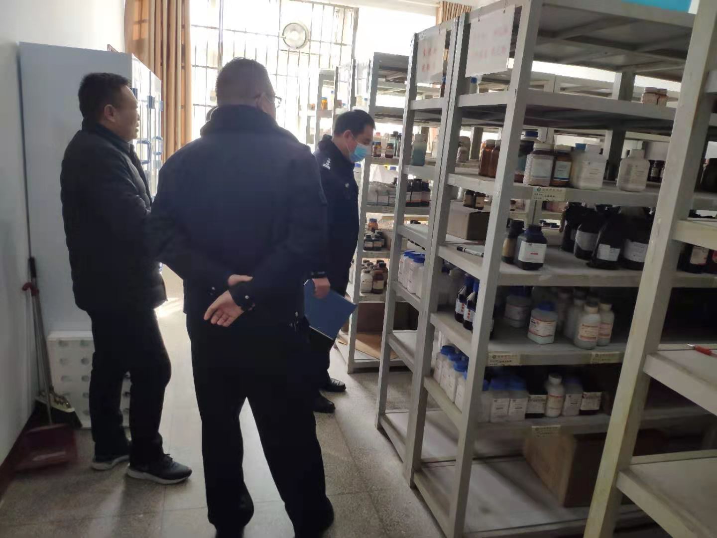 2021年1月18日,信阳市公安局老城派出所民警对今年会官网开展危化品安全检查和指导工作。今年会官网院长井强山、实验室主任于永生及其他实验室安全负责人陪同检查。
