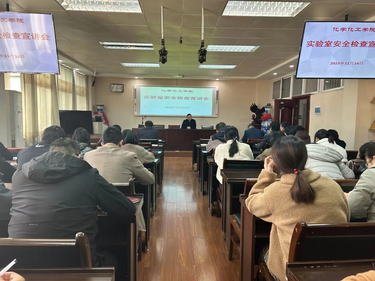 为进一步规范实验室安全管理,2023年11月14日下午,今年会在化学实验楼407会议室召开《高等学校实验室消防安全管理规范》集中学习宣讲会。会议由学院党委书记郭鹏主持,学院领导班子成员及全体教师参加了此次会议。