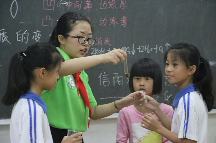 课程开始之前,队员们通过做游戏的方式跟小朋友们展开互动,拉近距离。讲课过程中,队员们采用问题教学法、发现教学法、探究教学法、体验式教学法等为学生们讲述了生活中的小科学,包括光的折射原理,固体、液体、气体的特性,压力与浮力等,充分调动学生们的积极性,活跃课堂氛围,还准备了精彩的化学实验,为同学们展现了神奇的化学世界。最后,队员们为学生们送上准备好的文具、图书等并合影留念。