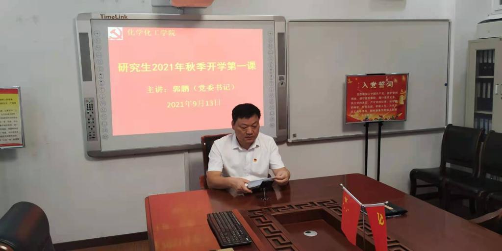 郭鹏结合2021年暑期抗灾防疫工作,以习近平“七一”重要讲话引入,从中国共产党的产生发展、改革开放的伟大实践和新时代的新征程、中国共产党百年发展的成功经验与启示等方面进行解读和宣讲,集中阐述了党的百年历程。他介绍,习近平总书记9月1号在中央党校秋季青年干部培训班开班仪式上作了重要讲话,校党委书记王文鹏、校长李俊9月6日云端线上讲授秋季新学期“开学第一课”,反复强调青年是国家的未来和希望,在中国共产党成立100周年之际,“十四五”胜利开局,“两个一百年”征程历史交汇,新时代青年学生身处难得的历史机遇中,在全球深刻变革大背景下,青年学生肩上的责任尤为重大。郭鹏勉励全体研究生要进一步坚定道路自信、理论自信、制度自信、文化自信,增强做中国人的志气、骨气、底气,树立为祖国为人民永久奋斗、赤诚奉献的坚定理想。不负时代、不负韶华、不负人生,为实现中华民族伟大复兴添砖加瓦、不懈奋斗。