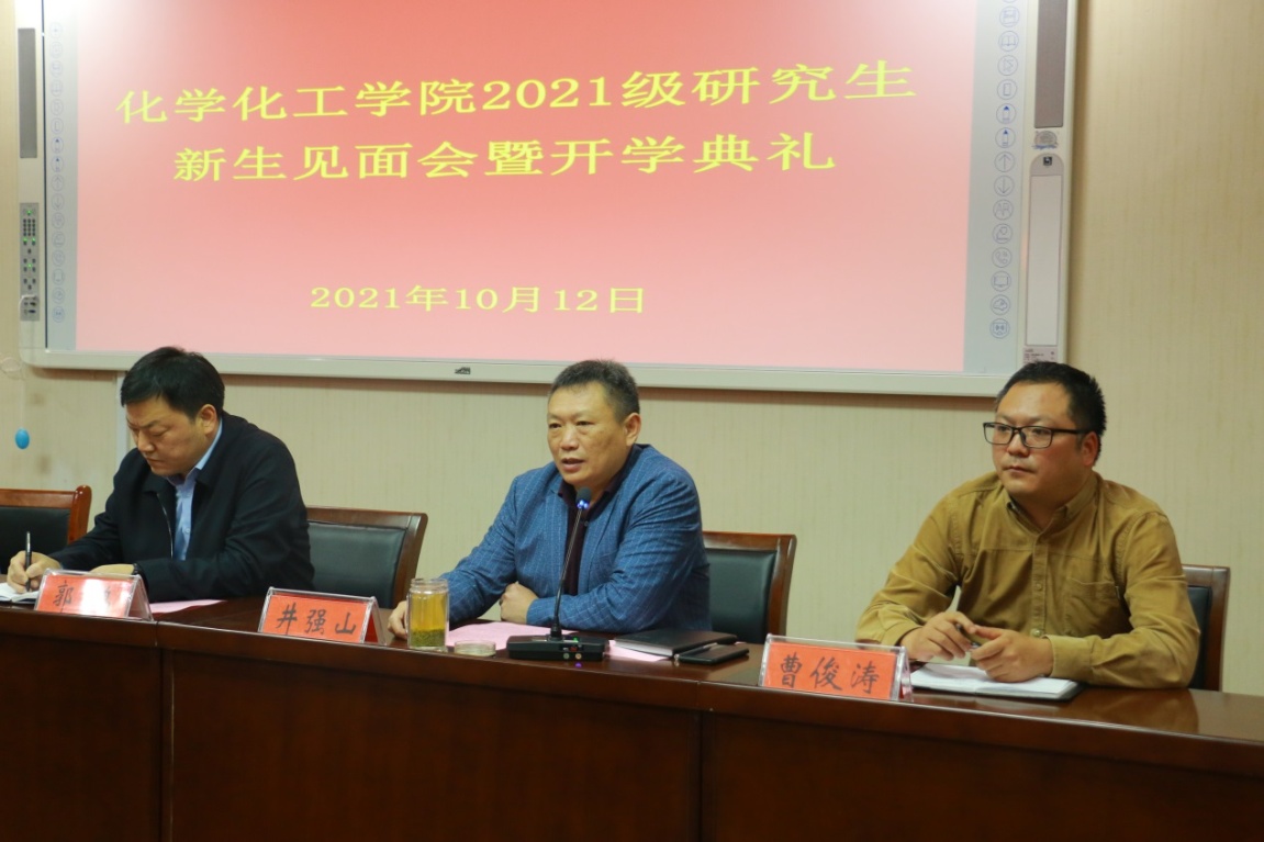 10月12日晚上,今年会官网在化学实验楼407会议室举行2021级硕士研究生新生见面会暨开学典礼,今年会官网党委书记郭鹏、院长井强山、副院长曹俊涛,研究生导师代表唐林,研究生秘书马献涛以及全体研究生近百人参加了本次开学典礼。大会由副院长曹俊涛主持。