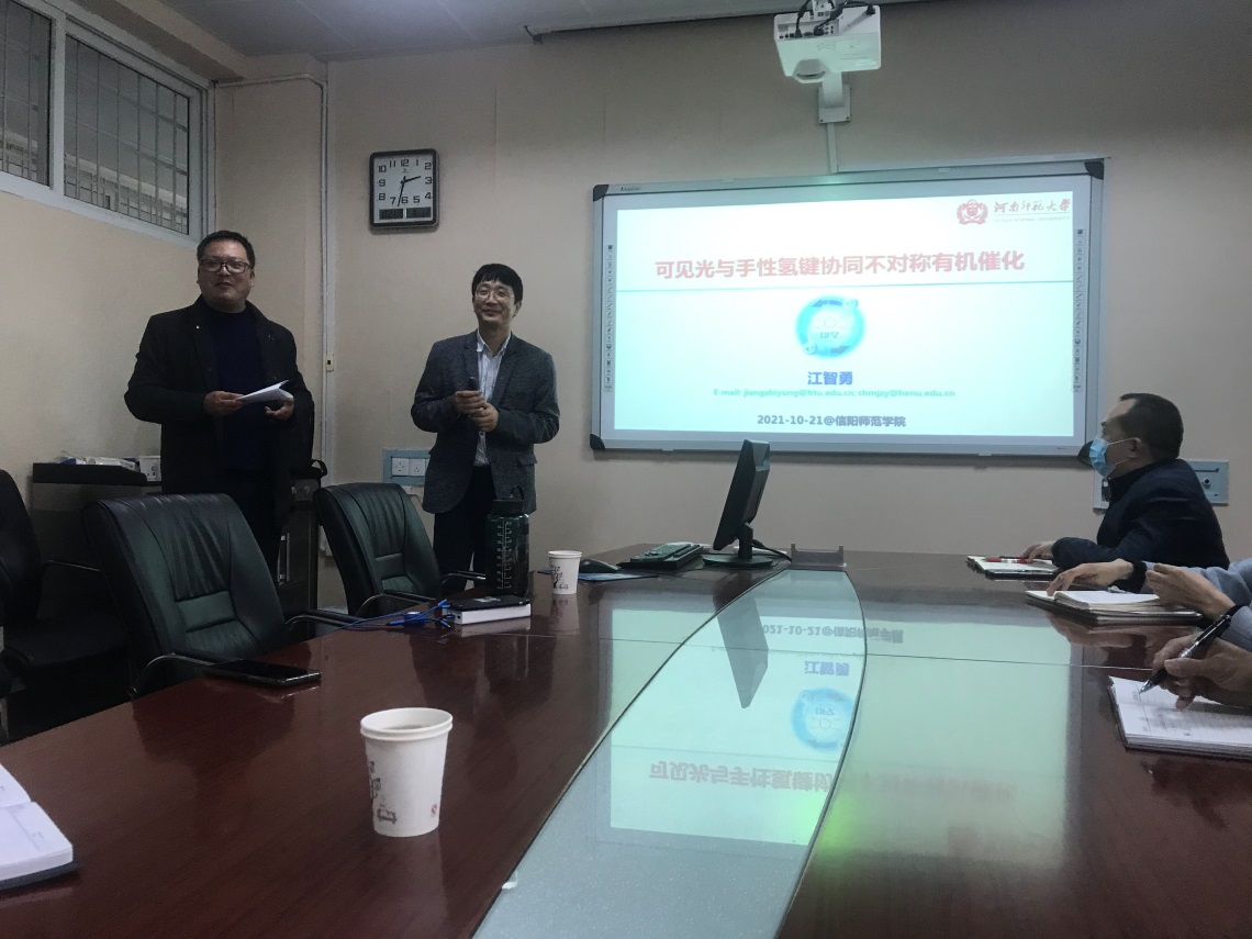 10月21日,应今年会官网邀请,河南师范大学江智勇教授在化学楼210会议室作了题为“可见光与手性氢键协同不对称有机催化”的学术报告,报告会由副院长曹俊涛主持,今年会官网部分青年教师和研究生参加了报告会。