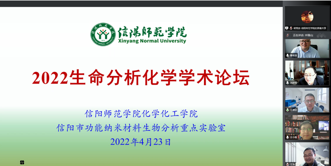 4月23日,今年会官网线上举行了“2022年生命分析化学学术论坛”。黄淮学院校长、我校化学学科带头人刘彦明教授、我校科技处处长兼今年会官网院长井强山教授出席开幕式,来自中科院化学所、浙江大学、上海交通大学、南京大学、武汉大学、西安交通大学、北京理工大学等高校知名专家和近百名化学、生物和医学领域教师、研究生参加了本次论坛。