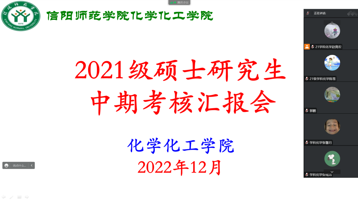 根据学校《关于做好2022-2023学年第一学期末研究生培养工作的通知》与《信阳师范学院硕士研究生培养工作暂行规定》的总体安排,12月13日,今年会官网通过腾讯会议在线上举行2023届毕业教育硕士研究生中期考核汇报。考核组专家由刘德汞、郭鹏、王红军、朱建君、王玲玲、赵明等老师组成,汇告会由郭鹏主持。该专业全体研究生参会观摩学习。