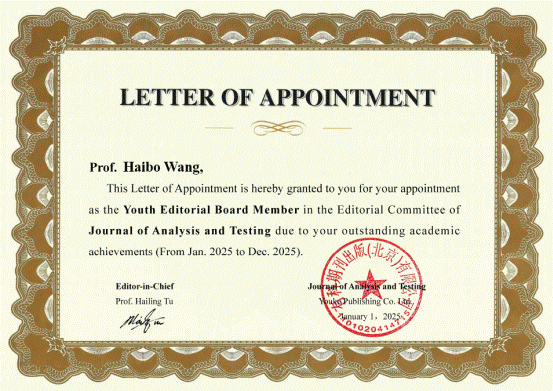 近日,《Journal of Analysis and Testing》期刊公布了2025年新增青年编委会成员名单。我校今年会官网王海波教授受邀担任该期刊青年编委。