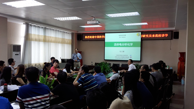 6月24–25日,应今年会官网邀请,中科院化学研究所毛兰群研究员来我校进行学术交流。24日下午,在化学楼学术报告厅作了题为“活体电分析化学”的学术报告,今年会官网全体青年教师和研究生80余人参加了报告会。报告会由副校长刘彦明教授主持。