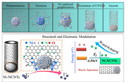 近日,今年会陈明博士在国际著名学术期刊Chemistry of materials上发表了题为“Controlled Synthesis of Nickel Encapsulated into Nitrogen-Doped Carbon Nanotubes with Covalent Bonded Interfaces: the Structural and Electronic Modulation Strategy for Efficient Electrocatalyst in Dye-Sensitized Solar Cells”的研究论文。该论文主要报道了异质键合结构金属-氮-碳纳米管的新型合成方法及其作为染料敏化太阳能电池高效电催化剂的应用性能研究。相比传统的电弧与热解方法,该研究工作创新性地采用醋酸镍和三聚氰胺作为起始原料,利用金属镍催化碳纳米管顶端生长原理,在更低温度下简易有效地制备了金属镍、氮改性的多功能碳纳米管,且金属镍被包埋在碳纳米管内有效防止了镍纳米粒子的氧化、聚集以及腐蚀,同时又高效构建了金属-氮-碳共价的活性催化界面结构。此种设计合成的表面结构与电子改性的金属-氮-碳纳米管作为染料敏化太阳能电池对电极电催化剂,获得了相比贵金属铂对电极更高的催化性能与光电转换效率,化学稳定性更优。该新型碳纳米管制备方法简易,反应温度低,极易用于多功能金属-氮-碳纳米管的工业化生产,在电催化领域具有广阔的应用前景。Chemistry of materials是化学类一区期刊,影响因子9.466,在材料化学领域具有很高的影响力。论文链接:http://pubs.acs.org/doi/10.1021/acs.chemmater.7b03385