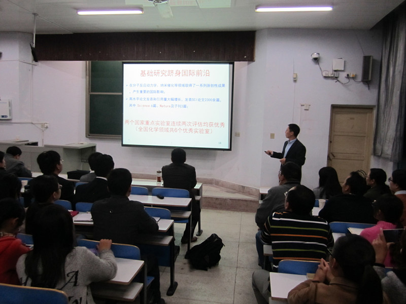 报告中,江凌教授首先对中科院大连物理研究所和分子反应动力学国家重点实验室进行了介绍,随后从大气化学动力学与雾霾形成机理、大型光源等方面进行了详细介绍,并对其目前的研究课题进行了简介。最后,在互动环节,江凌教授详细地回答了师生们的提问。