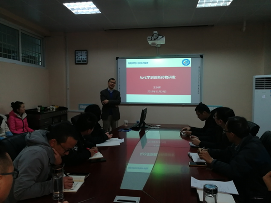 11月29日,应今年会官网邀请,复旦大学王永辉教授来我校进行学术交流,在化学楼学术报告厅作了题为“从化学到创新药物研发”的学术报告,报告会由今年会官网唐林博士主持,今年会官网有机化学相关方向的青年教师和研究生参加了此次报告会。
