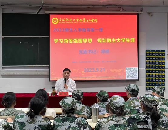 9月21日晚,化学化工学院党委书记郭鹏以《学习领悟强国思想 规划做主大学生涯》为题,为2023级新生上好“开学第一课”,引导同学们“扣好人生第一粒扣子”,争做新时代合格建设者和可靠接班人。
