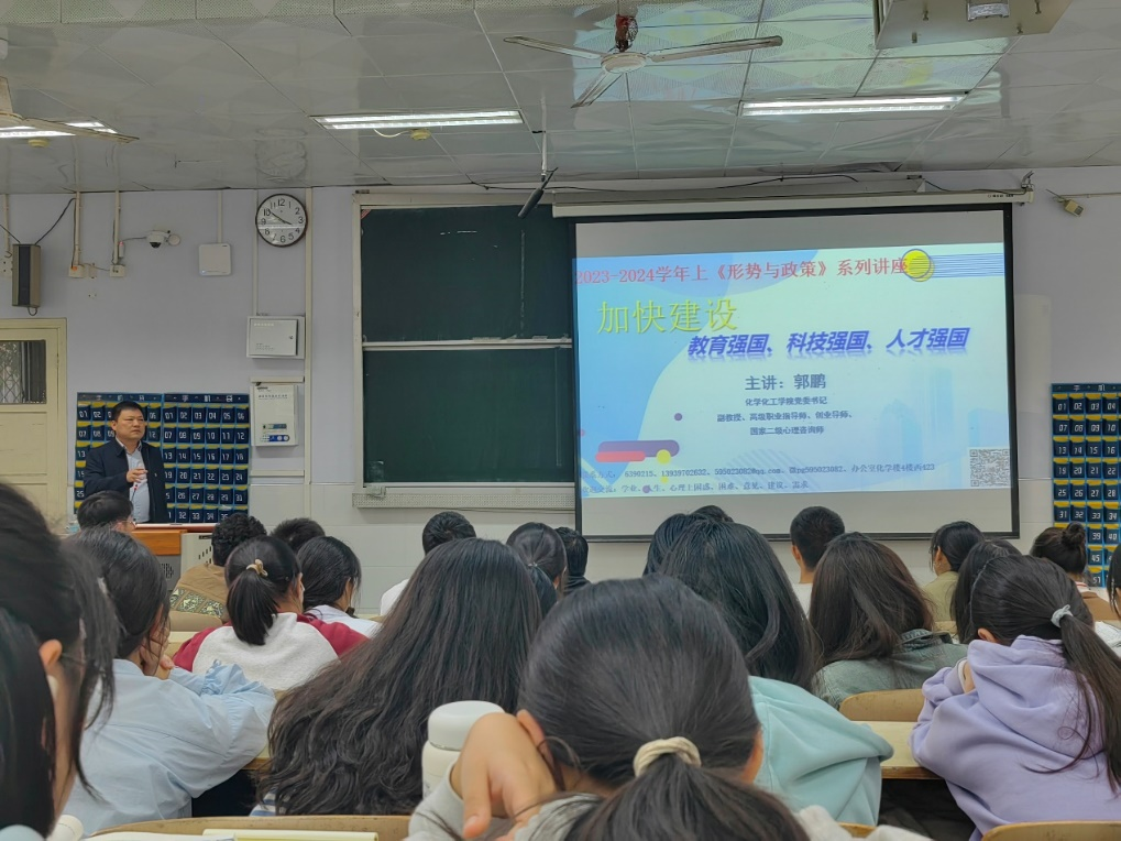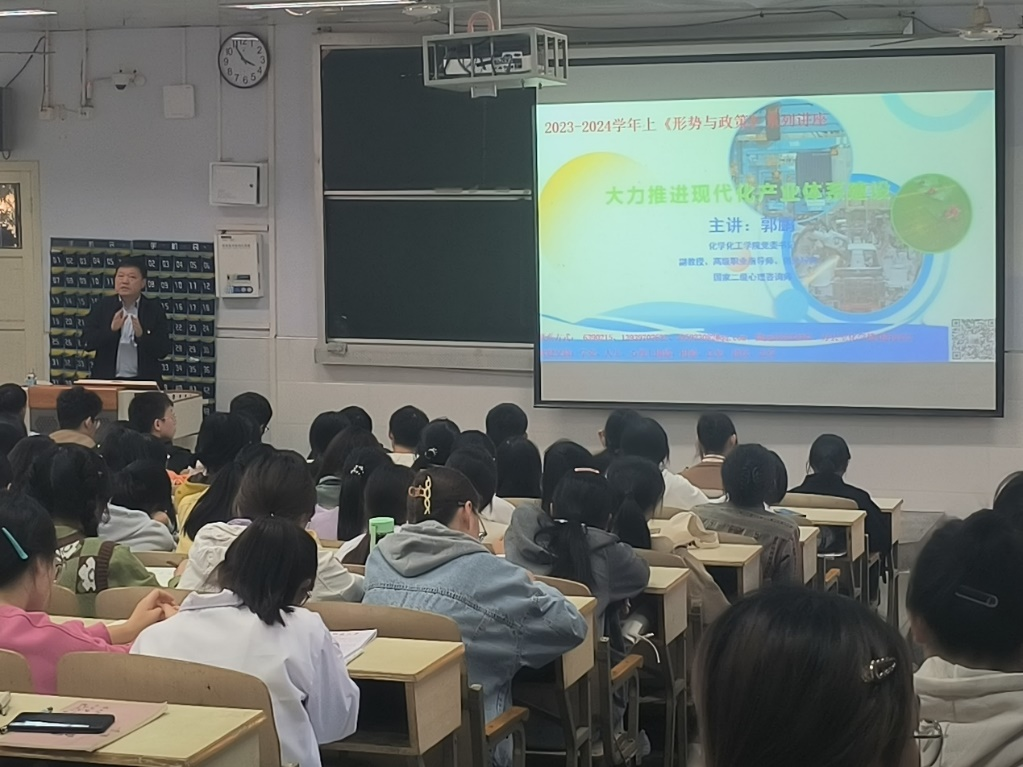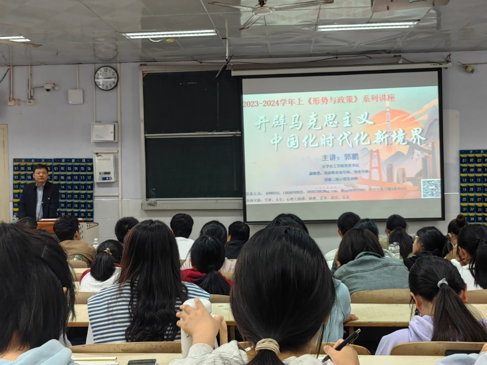 2023年10月份,今年会官网党委书记郭鹏带头深入学生班级开讲2023-2024学年上学期《形势与政策》专题讲座,宣讲形势与政策知识,为所分包联系的2023级化学本科班青年学生集中解读《习近平新时代中国特色社会主义思想概论》有关内容知识。