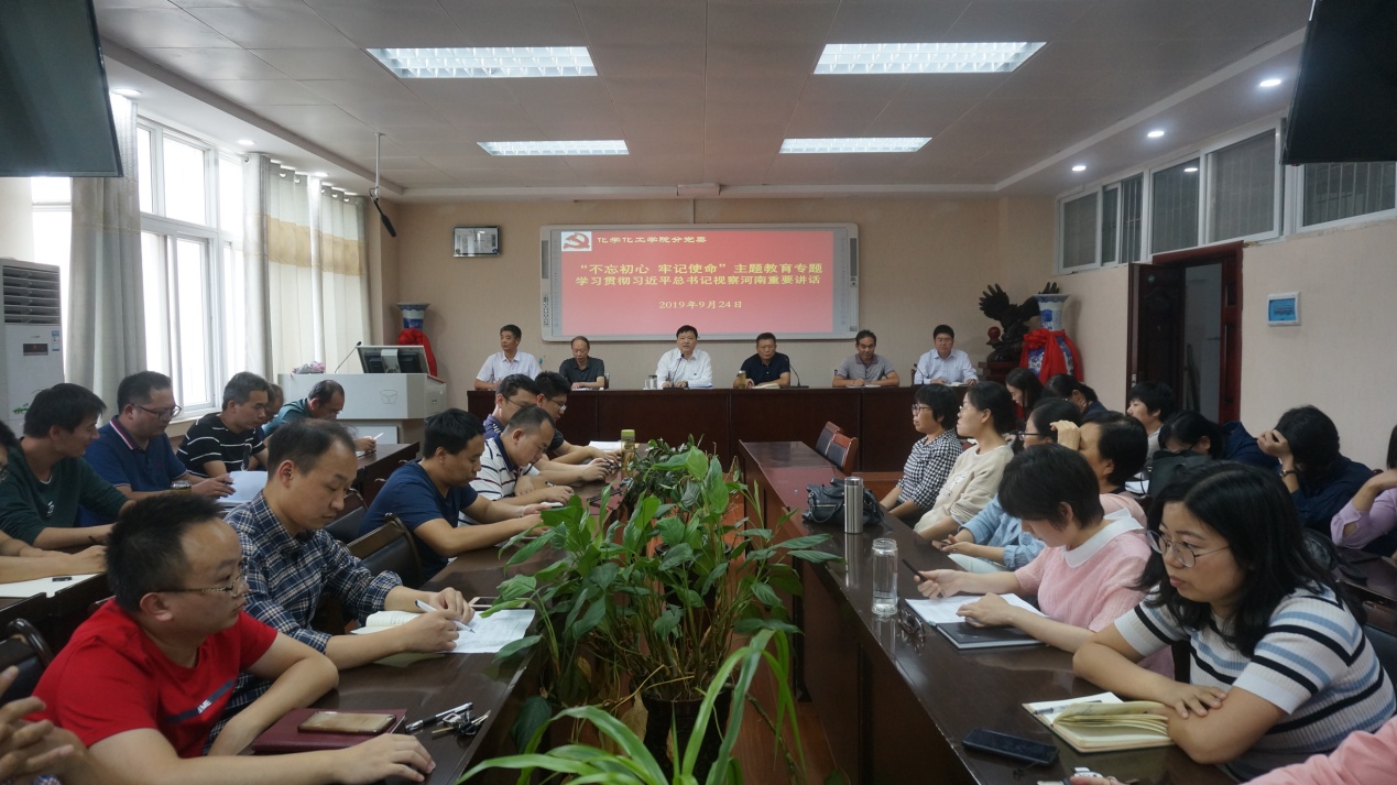 他讲到,习近平总书记到信阳的新县、光山考察调研,充分体现了对革命先辈的敬仰缅怀、对传承好红色基因的高度重视、对老区人民的真情大爱。习近平总书记的到来,让信阳人民欢欣鼓舞,让信阳师范学院全体师生开心,我们应牢记总书记的殷切嘱托,“牢记红色政权是从哪里来的”, “要把老区建设得更好” ,“让革命烈士含笑九泉”。作为信阳师范学院的教师,要把我们的学校建设得更好,要坚定信心,迎难而上,苦干实干,打赢化学师范专业认证攻坚战、争创化学本科一流专业建设新业绩、争取化学博士授权支撑学科新突破,全力以赴谱写高水平师范大学建设的新篇章,以优异成绩喜迎新中国成立70周年庆典。