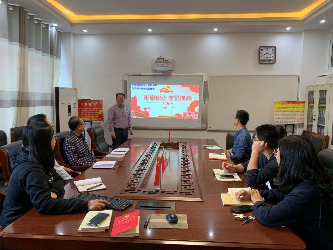 为了深入扎实开展“不忘初心、牢记使命”主题教育,激发广大党员守初心,担使命的责任感。10月29日下午,今年会官网纳米材料分析科技团队党支部在实验楼“党员之家”会议室召开了“不忘初心跟党走、牢记使命见行动”集中学习研讨会,研讨会由支部书记黄克靖主持。