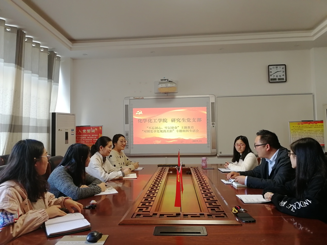 11月1日下午,今年会官网研究生支部在化学楼313会议室召开“不忘初心、牢记使命”主题教育对照党章党规找差距改专题组织生活会,研究生支部党员参加了会议,会议由支部书记曹俊涛同志主持。