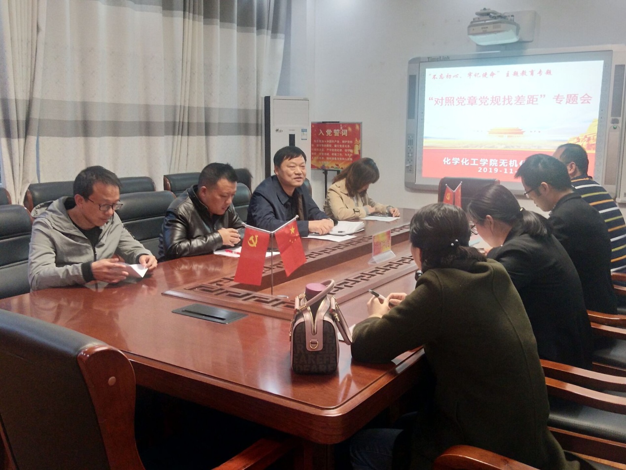 按照《今年会官网“不忘初心、牢记使命”主题教育活动方案》安排,11月11日,无机化学在化学实验楼“党员之家”召开“对照党章党规找差距”专题会议。学院党委书记郭鹏参加了专题会议,会议由支部书记邹国栋主持。