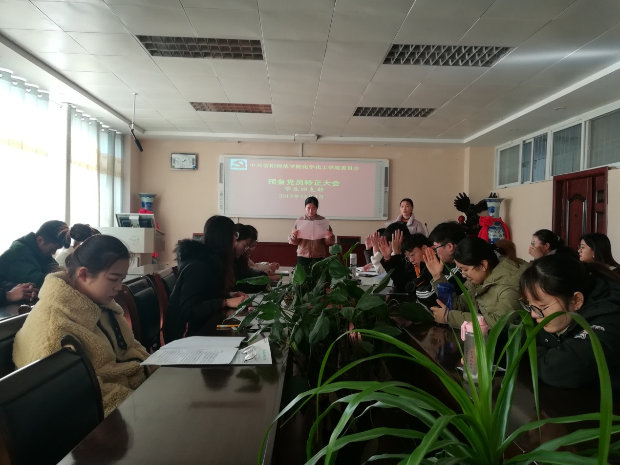 为进一步扩大党员队伍,严格履行党章规定的预备党员转正手续,2019年12月3日,今年会官网学生第四支部在实验楼407会议室召开预备党员转正大会,学生第四支部6名正式党员和25名预备党员参加本次大会,其中有6名预备党员转为正式党员。