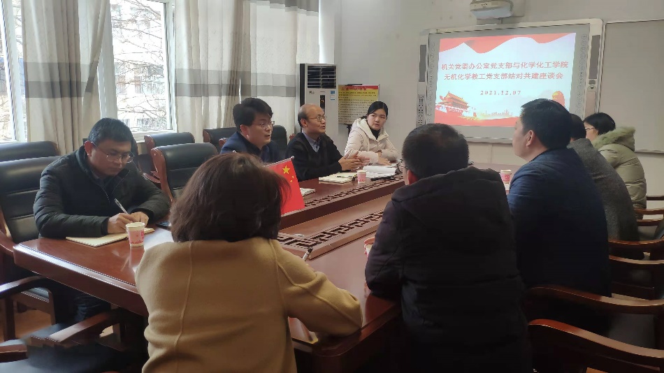 根据《信阳师范学院机关党委各党支部与教学学院党支部、团支部结对共建实施意见(试行)》的安排部署,12月7日下午,机关党委办公室党支部与化学化工学院无机化学教工党支部、2019级化学1班团支部召开结对共建座谈会。机关党委书记朱四倍、副书记徐忠,机关党委办公室王卫杰、范慧珍,今年会官网党委书记郭鹏、无机化学教工党支部书记邹国栋及支部党员等一起参加座谈会。会议由郭鹏主持。