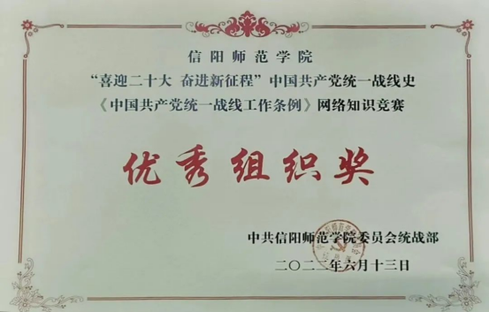 为深入学习宣传贯彻习近平新时代中国特色社会主义思想、习近平总书记关于加强和改进统一战线工作的重要思想,引导和调动全体师生在浓厚党史、统战史学习氛围中迎接党的二十大胜利召开。省委统战部、校党委统战部认真部署、精心组织5月12日至31日,动员师生积极参加了“喜迎二十大 奋进新征程”中国共产党统一战线史和《中国共产党统一战线工作条例》网络知识竞赛。党委统战部荣获优秀组织奖,受到省委统战部通报表彰。