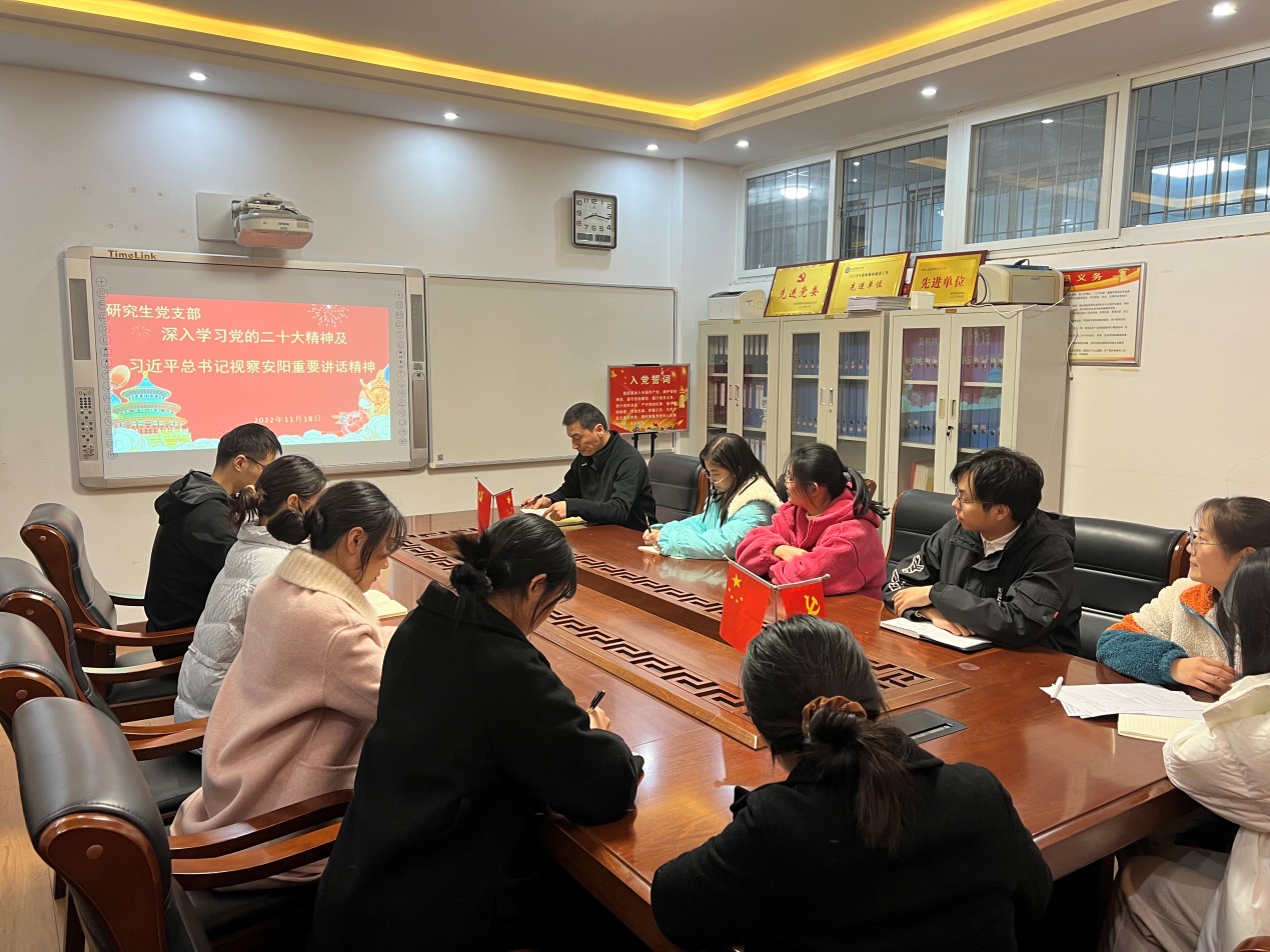 11月18日,研究生党支部于化学楼313室举行深入学习党的二十大精神以及习近平总书记视察安阳重要讲话精神微党课,研究生支部书记马献涛指出,各位青年学生党员,作为党和国家未来的希望,要坚定文化自信,增强做中国人的自信心、自豪感;要发扬红旗渠精神,撸起袖子加油干,为实现党的二十大奋斗目标,踔厉奋发、勇毅前行。