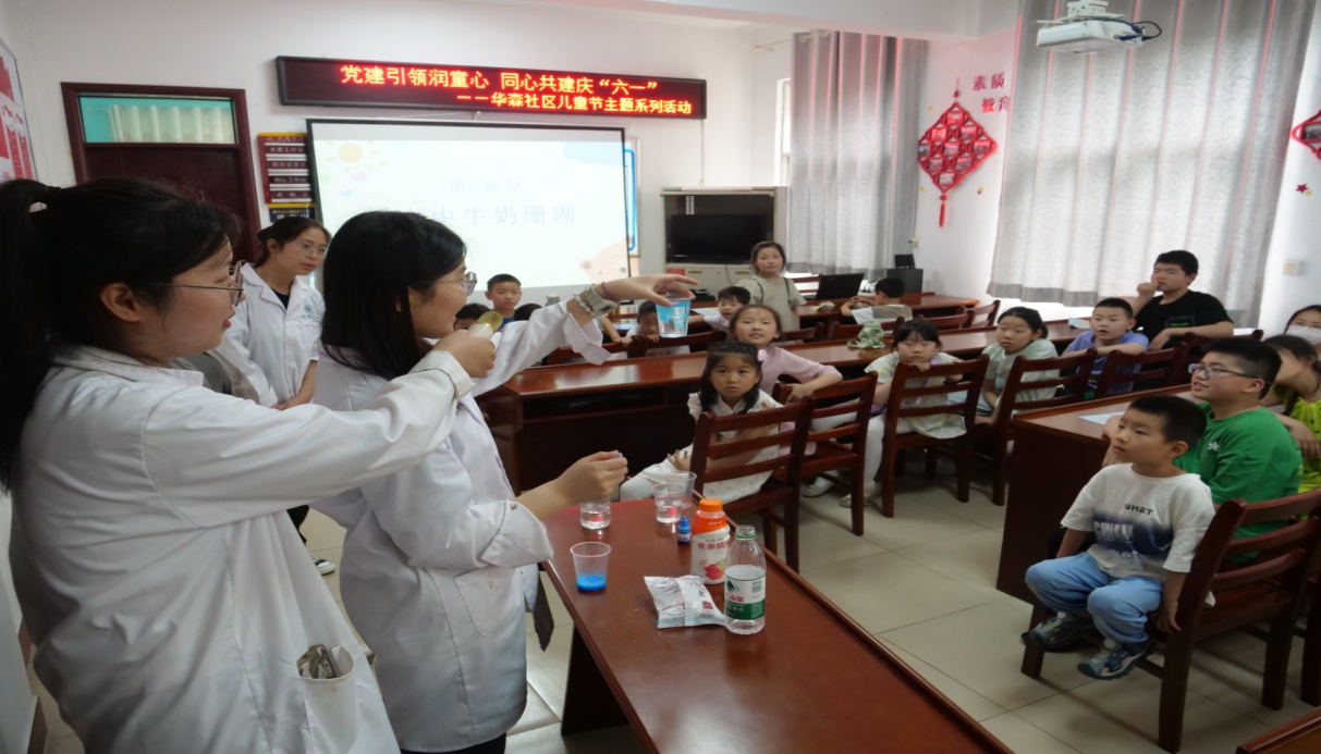 今年会官网的党员志愿者为小朋友们带来了一场别开生面的趣味实验。志愿者们在对化学实验做基本讲解后,分别展示了《水中圆环》《水中牛奶珊瑚》《彩虹塔》《彩虹喷泉》四个化学实验,让社区小朋友感受到了化学的魅力,激发了他们对科学的热爱和探索精神。志愿者充分运用所学化学知识服务居民,使化学知识深入居民,走进社区,形成了“党组织组织支持、大学生积极、社区群众欢迎”的良好实践氛围,化院学子在实践中受教育、长才干、做贡献。