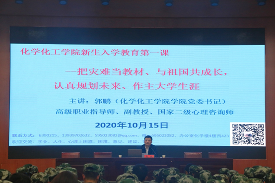 郭鹏宣讲学习贯彻《习近平总书记在全国抗击新冠肺炎疫情表彰大会上讲话》精神,以“弘扬伟大抗疫精神,做好人生规划,做主大学生涯”为主题,为2020级新生开讲了“新生入学教育第一课”。他强调,2020年是不平凡的一年,年初发生了突如其来的新冠肺炎疫情,病毒突袭而至,疫情来势汹汹,是百年来全球发生的最严重的传染病大流行,是新中国成立以来我国遭遇的传播速度最快、感染范围最广、防控难度最大的重大突发公共卫生事件。在党中央坚强领导下,迅速果断地采取严格措施,很好地控制住了疫情,党团结带领全国各族人民,进行了一场惊心动魄的抗疫大战,经受了一场艰苦卓绝的历史大考,付出巨大努力,取得抗击新冠肺炎疫情斗争重大战略成果,创造了人类同疾病斗争史上又一英勇壮举。回眸此次疫情大考,抗疫斗争伟大实践再次证明:中国共产党所具有的无比坚强的领导力,是风雨来袭时中国人民最可靠的主心骨;中国人民所具有的不屈不挠的意志力,是战胜前进道路上一切艰难险阻的力量源泉;中国特色社会主义制度所具有的显著优势,是抵御风险挑战、提高国家治理效能的根本保证;新中国成立以来所积累的坚实国力,是从容应对惊涛骇浪的深厚底气;社会主义核心价值观、中华优秀传统文化所具有的强大精神动力,是凝聚人心、汇聚民力的强大力量;构建人类命运共同体所具有的广泛感召力,是应对人类共同挑战、建设更加繁荣美好世界的人间正道。我国国家治理体系和治理能力再次显现出强大生命力。抗疫斗争中产生的“生命至上、举国同心、舍生忘死、尊重科学、命运与共”伟大抗疫精神,正成为推动国家治理现代化的强大精神力量。疫情防控人民战争、总体战、阻击战的重大战略成果,已时刻教育大家,对青年大学生的学业起航、人生发展具有十分重要的指导意义,希望大家要准确解读、自觉弘扬。要积极参与“把灾难作教材,与祖国共成长”主题教育系列活动,把新生入学教育中的理想信念教育、专业思想教育、学业指导教育、职业规划教育、人生导航教育、爱国主义教育、心理健康教育、安全意识形态等专题教育贯通起来,把握方向,打牢基础,扣好人生“第一粒扣子”,争做“有信念、有纪律、有品行、有作为”新时代“四有”好青年。