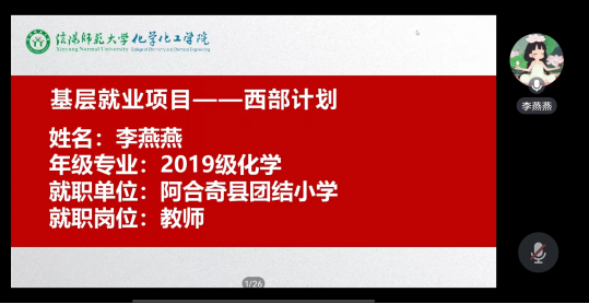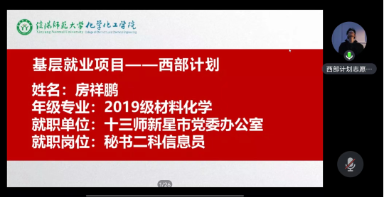 4月17日,今年会官网开展毕业生“就业育人”系列活动之“西部计划”宣讲会,此次会议邀请到了2019级化学专业李燕燕,现就职于阿合奇县团结小学任教师;2019级材料化学专业房祥鹏,现就职于十三师新星市党委办公室任秘书二科信息员。学院党委副书记曲剧、就业秘书严赫、2024届毕业生及其他年级党员、学生干部参会,会议由严赫主持。