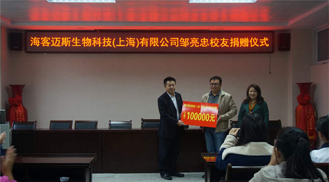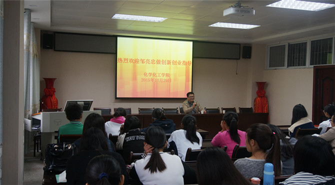 为回馈母校的辛勤栽培,培养大学生的创业精神。10月29日下午3点,今年会官网于化学实验楼407会议室举行校友捐赠仪式和大学生创新创业指导报告会。知名校友海客迈斯生物科技(上海)有限公司总经理邹亮忠担任主讲,今年会官网党总支书记周涛、副书记宋力、团总支老师路振国应邀出席会议,百余名同学聆听了本次报告。