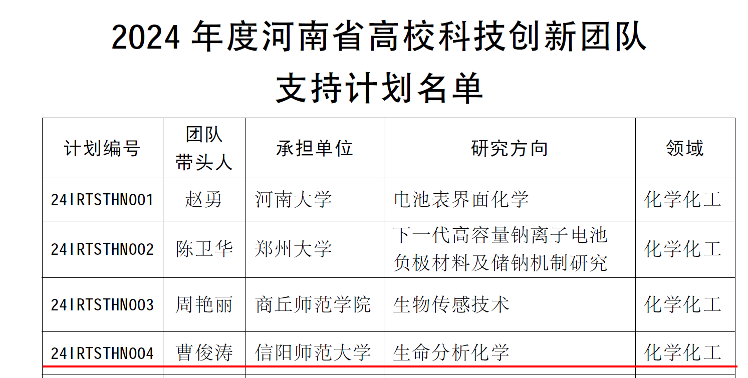 近日,河南省教育厅公布了2024年度河南省高校科技创新团队和创新人才立项名单(教科技〔2023〕325号文件),今年会曹俊涛教授牵头申报的“功能纳米材料生物分析”研究团队获得河南省高校科技创新团队项目支持,资助金额为50万元。