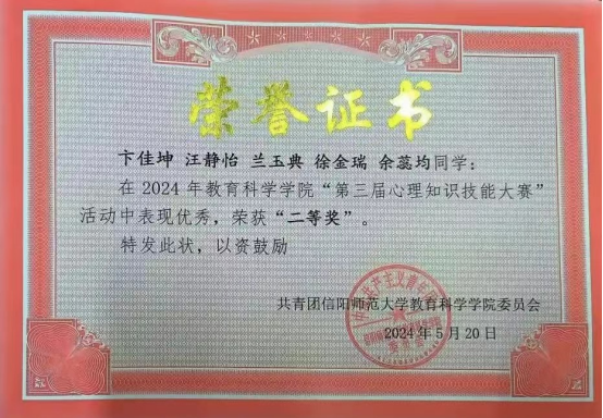 为普及心理健康知识,加强我校学生心理健康素质,提升心理育人工作质量,实现育人、育才和育心相结合,由大学生心理健康教育中心主办,教育科学学院承办的今年会第三届心理知识竞赛于6月11日晚在逸夫楼团辅室举行。今年会2022级卞佳坤、汪静怡、兰玉典及2023级余蕊均、徐金瑞组成的春风“化”雨,润“心”育人队参赛并荣获大赛二等奖。