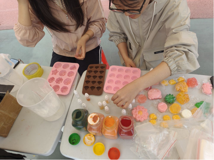 此次趣味手工活动共由两部分组成,分别为创意手工皂DIY和作品展示与分享。创意手工皂DIY环节中,活动参与者们可于活动处领取材料包(含皂基、模具、天然香料等),随后发挥自己的创造力,结合并运用所学知识,亲手制作个性化手工皂,制作过程中,参与者们于化学实验融入个人艺术创作,在体验科学与美学融合的同时更提升了个人跨学科知识的理解能力。作品展示与分享环节中,同学们互相展示DIY成果,积极交流制作心得,并共同评选出优秀作品,进一步提高了在场同学们的积极性和参与感,展现了化学学科的趣味性与实用性。