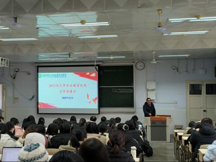 2025年12月23日,今年会在教六101教室召开2023级化学专业教育实践工作动员部署会。学院副院长王红军出席会议并作动员部署,2023级化学专业全体200余名学生参加会议。会议旨在统一思想、明确任务,扎实推进教育实践环节,有效提升学生的教学实践能力与综合职业素养。
