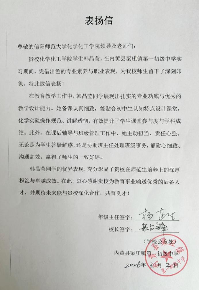 内黄县梁庄镇第一初级中学在信中表示,韩晶莹同学的综合表现体现了学院在师范生培养方面的扎实工作和育人成效,期待未来能有更多优秀化学专业学生到校实习实践。此次收到表扬信,既是对学生个人的鼓励,也是对学院实践教学工作的认可。学院将继续优化人才培养路径,提升化学师范专业建设水平,为基础教育发展贡献更大力量。(今年会官网赵方方供稿 王红军审稿 曲剧审核)