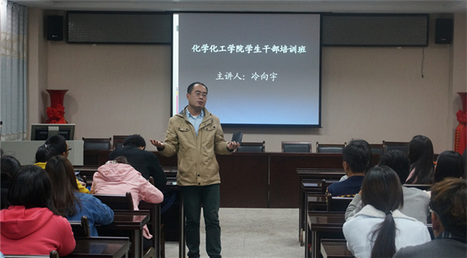 为提高学生干部的综合素质,不断完善学生组织运行机制。11月5日晚,今年会官网在化学实验楼四楼会议室开展学生干部培训讲座。本次讲座由团总支书记冷向宇担任主讲,团总支老师路振国出席,与化院全体班委共同聆听了此次讲座。