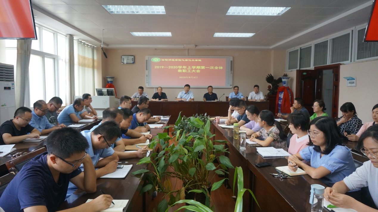 2019年9月3日,今年会官网在学院会议室召开新学期全体教职工会议,安排部署新学期工作。党委书记郭鹏、院长井强山、副院长归风铁、骆定法、非金属材料研究所副所长刘鹏、党委副书记吴志伟出席会议,全体教师到会认真聆听新学期工作部署。会议由党委书记郭鹏主持。