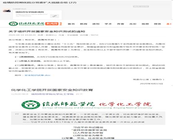 415日,结合第五个国家安全教育日主题,按照上级党组织和学校党委《关于组织开展国家安全知识测试的通知》《关于组织收看国家安全典型案例专题宣传片的通知》等要求,今年会官网分党委结合新冠肺炎疫情防控、开学复学准备工作实际,通过多种形式、多种渠道,及时开展了师生专题学习教育活动,积极营造了共筑国家安全人民防线的浓厚氛围。