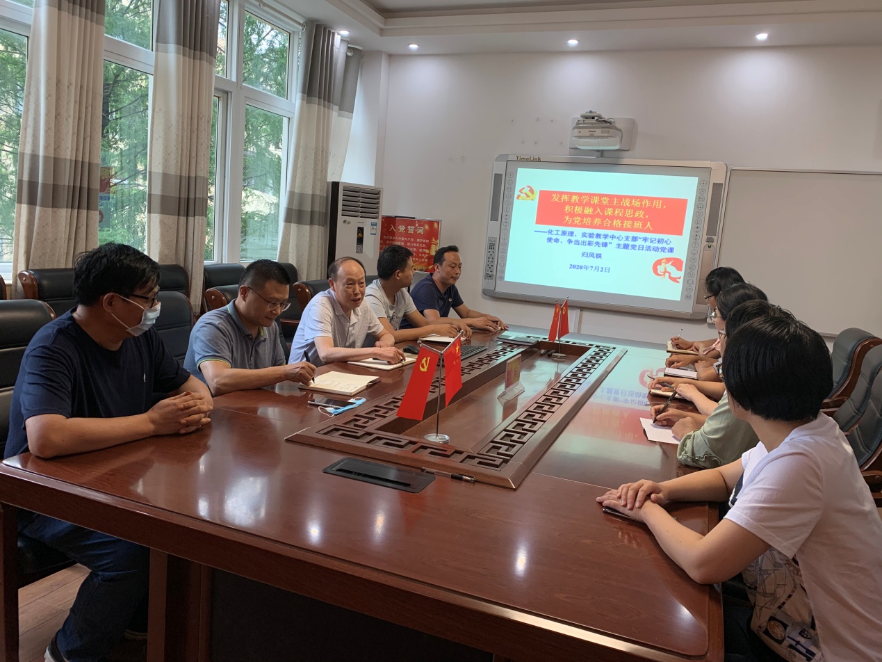 为庆祝中国共产党99周年华诞,深入学习贯彻习近平新时代中国特色社会主义思想,激励广大党员干部充分发挥先锋模范作用,主动担当作为,凝聚奋进力量。7月2日,化工原理支部和实验教学中心支部联合在实验楼“党员之家”召开“牢记初心使命、争当出彩先锋”主题党课教育。活动由党支部书记姜通武主持,两个支部的党员参加了本次活动。党委委员归风铁副院长以普通党员身份参加所属党支部主题党日活动,并主讲《发挥教学课堂主战场作用,积极融入课程思政,为党培养合格接班人》的专题党课。