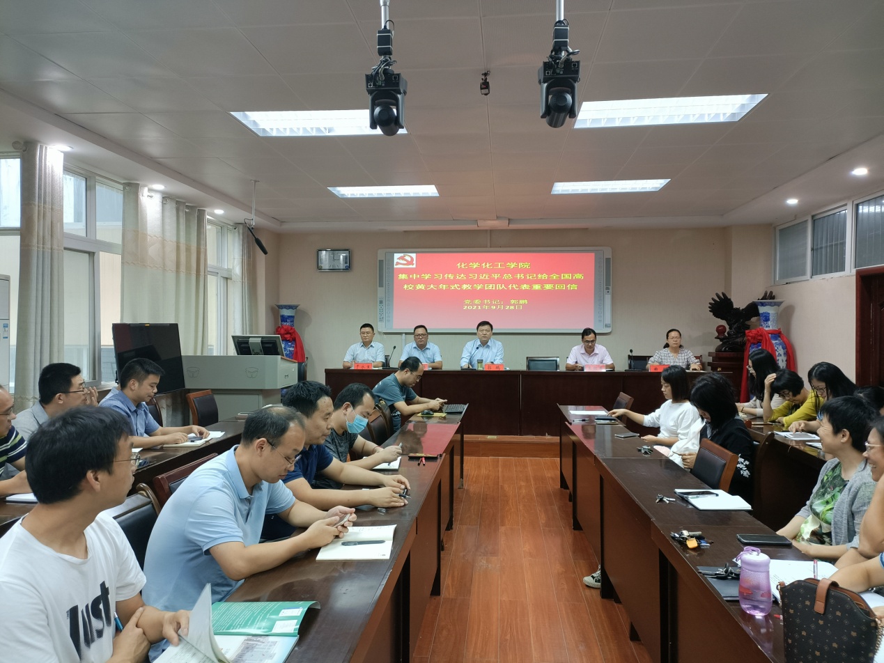 9月28日下午,今年会官网在化学楼407会议室召开全体教师大会,集中学习第37个教师节前习近平总书记《给全国高校黄大年式教师团队代表的重要回信》(简称《回信》)、传达2021年学校中层干部培训暨秋季开学工作会议精神。会议由学院党委书记郭鹏主持。