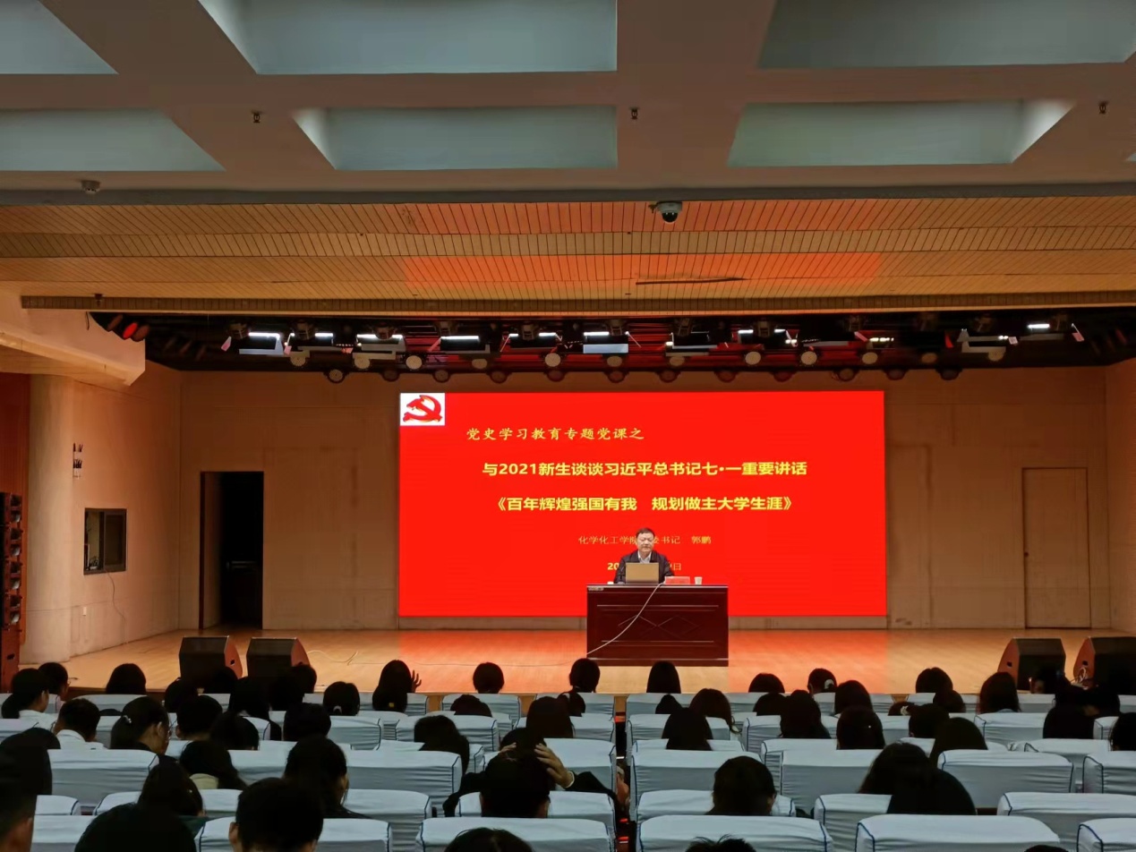 郭鹏以7月1日习近平在庆祝中国共产党成立104周年大会的重要讲话重点金句内容引入,从中国共产党的产生发展、改革开放的伟大实践和新时代的新征程、中国共产党百年发展的成功经验与启示等方面重点分享解读,集中阐述了党的百年历程。郭鹏通过对共产党初期的艰难抗争到中国共产党领导社会主义革命建设的介绍,使同学们进一步加深了对党史的了解,他希望2021级新生同学们做到知史爱党、知史爱国;通过讲解新中国在党的领导下取得的伟大成就,他要求大家在党史学习教育中,要真正将党史学习总结好、传承好、发扬好,将社会主义核心价值观融入大学学习生活日常行为习惯中,展现出新时代青年大学生的良好风貌。新时代青年大学生正身处在难得的历史机遇中,在全球深刻变革大背景下,青年人肩上的责任尤为重大。郭鹏勉励2021级学子要进一步坚定道路自信、理论自信、制度自信、文化自信,增强做中国人的志气、骨气、底气,树立为祖国为人民永久奋斗、赤诚奉献的坚定理想。不负时代、不负韶华、不负人生,为实现中华民族伟大复兴添砖加瓦、不懈奋斗。