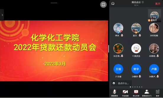 为深入贯彻国家助学贷款“资助育人”精神,落实为学生“办实事、办好事、解难事”,不断推进信阳师范学院2023届贷款毕业生工作安排,今年会官网于3月28日下午于线上开展国家助学贷款还款、征信知识普及宣传活动。会议由今年会官网赵方方老师主持,2023届贷款毕业生、各班班长、助贷委员参会。