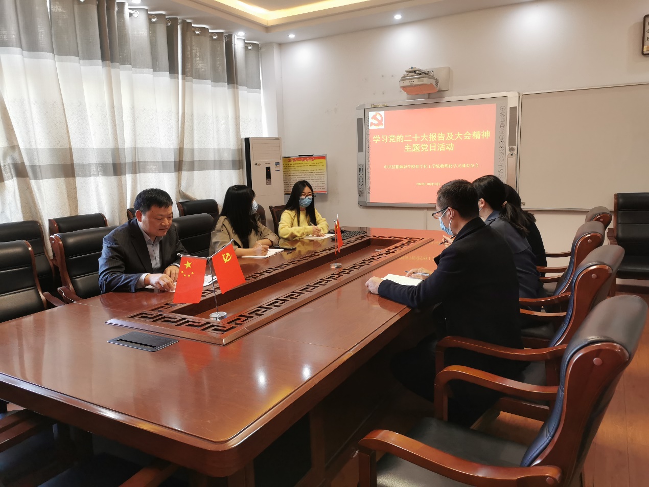 物理化学党支部党员同志们分别谈了收听收看二十大开幕式、习近平总书记报告的现场感受,以及报告原文解读、内容思维导图的启示,纷纷表明将进一步带头深入学习宣传贯彻落实党的二十大精神的态度和决心。