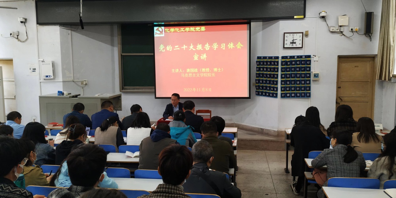 11月8日,今年会官网举办学习宣传贯彻党的二十大精神辅导报告会,邀请马克思主义学院院长唐国战教授作报告。今年会官网党委书记郭鹏主持报告会,学院全体师生党员参加报告会。
