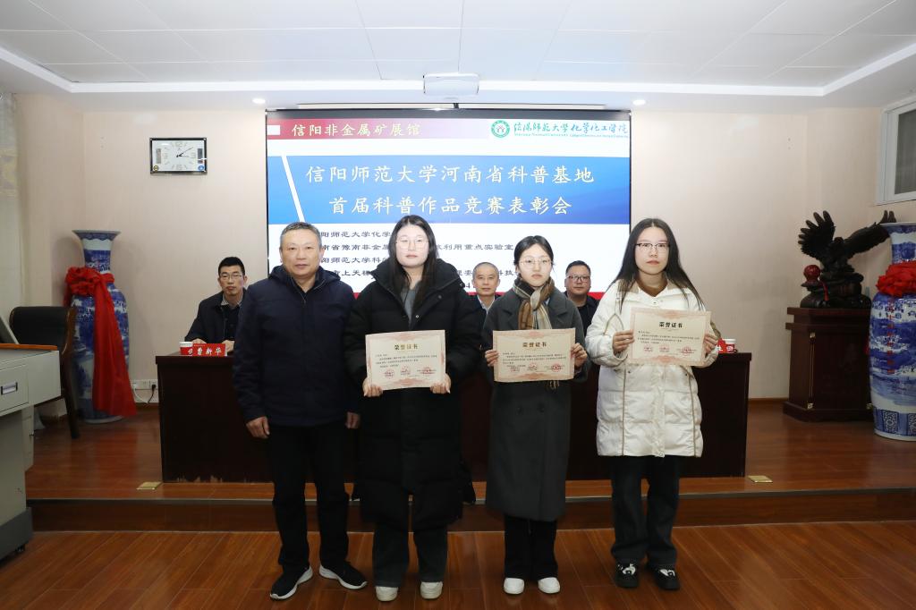 本次竞赛以河南省科普基地信阳非金属矿展馆为平台,旨在激发全校师生及社会对科学普及的热情。自启动以来,共收到来自11个院系、22个专业的近百件作品,包括科普文章、科普视频和PPT讲解等多种形式。这些作品内容丰富多彩,创意独特,寓教于乐,展现了我校高水平的科普创作能力和创作者们的才华。经过激烈竞争和公正评选,最终产生了4个一等奖、12个二等奖和20个优秀奖。井强山副校长为获奖代表颁发了荣誉证书。