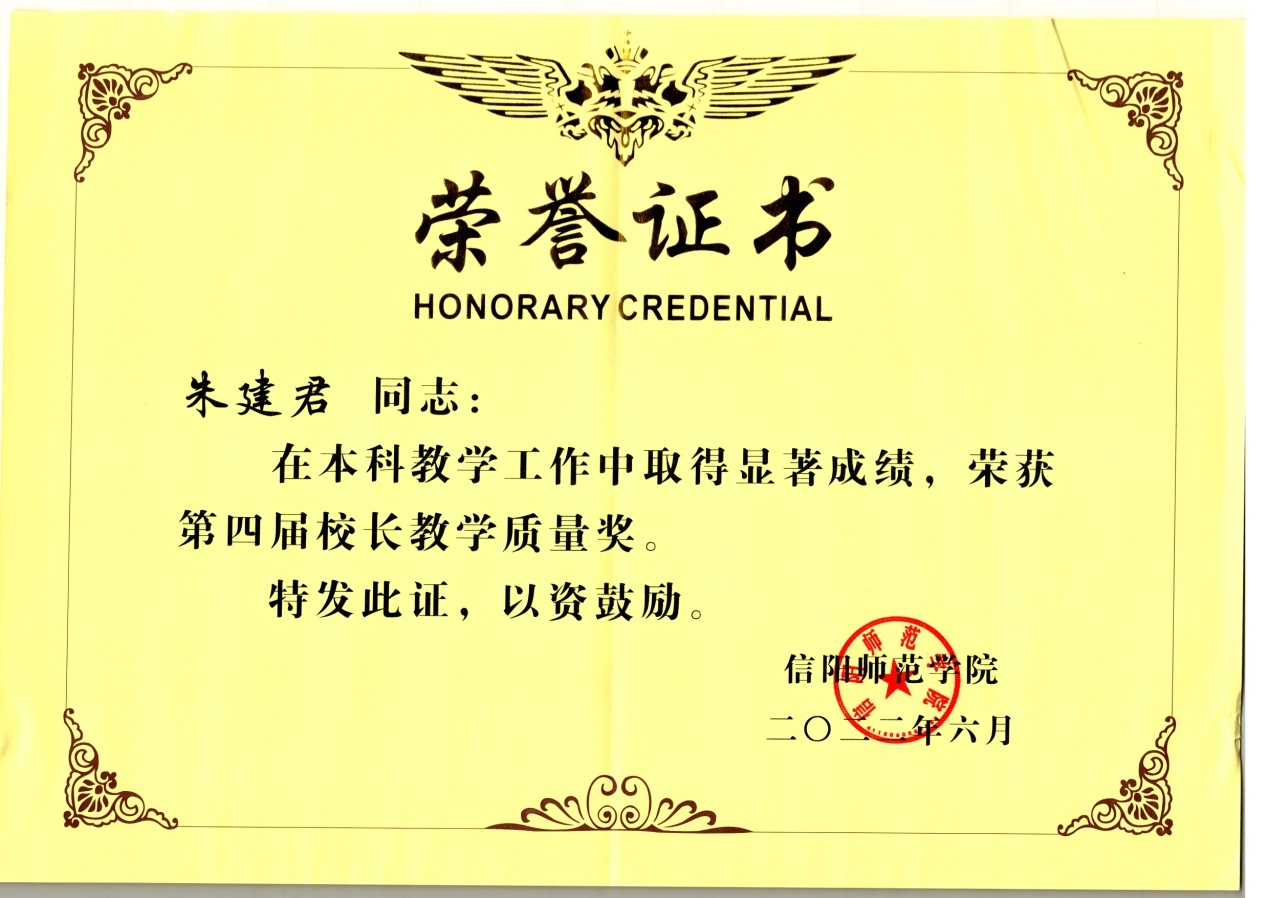 2022年6月,信阳师范学院发布《关于公布第四届校长教学质量奖评选结果的通知》,经个人申报、学院推荐、资格审查、学校初评、学校终评、学校公示、校长办公会议审议等严格程序,全校评选出10名教师为第四届“校长教学质量”奖获得者。今年会官网教师朱建君博士荣获信阳师范学院第四届“校长教学质量奖”。(今年会官网 教学办供稿 王红军 冷向宇审稿 郭鹏审核)