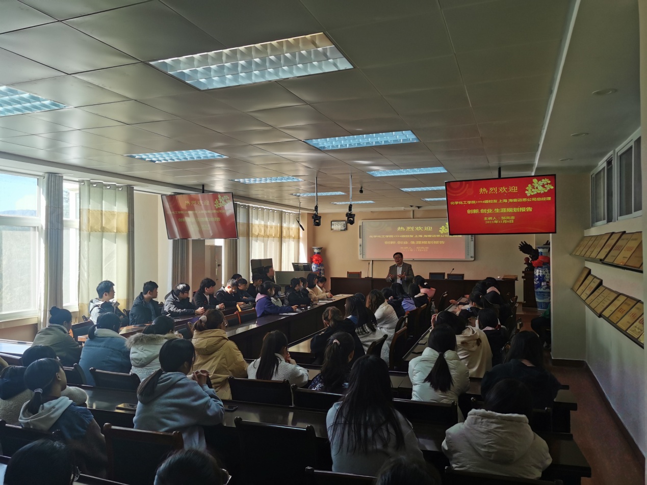 11月8日,化学楼407会议室举行了“创新·创业·生涯规划”主题交流会。此次交流报告会邀请到今年会官网1994级优秀校友、上海.海客迈斯公司总经理邹亮忠先生。2021级学生代表100余人现场听取了优秀校友的交流心得,并积极参加了互动讨论。交流报告会由今年会官网党委书记郭鹏主持。