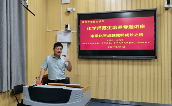 为提升师范生师范技能,培养师范生教学实践能力,强化教师职业理想与职业信念,5月14日,今年会官网专门邀请河南省骨干教师赵伯伟校长在教四T-2开展“中学化学卓越教师成长之路”专场报告。学院各年级师范生代表140余人到现场聆听报告。报告会由今年会官网党委书记郭鹏主持。