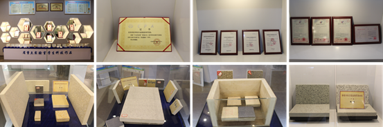 展厅最后则是科技成果转化展示。自主研发的隔热保温装饰一体化板材生产技术、装备及产业化成果,解决了隔热保温装饰一体化板的饰面层与保温层异质结构界面控制、保温层内部孔隙结构及性能调控、一次烧制成型工艺、非标专用设备设计等关键科学问题和工程技术,从基础理论研究、中试试验、非标装备研发到工业化生产,取得系列研究成果,成功实现产业化。年产150万平米的生产线也已落地。该课题基础理论研究由信阳师范学院完成,工业化生产由原信阳科美新型材料有限公司实施,以科技赋能助力大别山革命老区的建设。